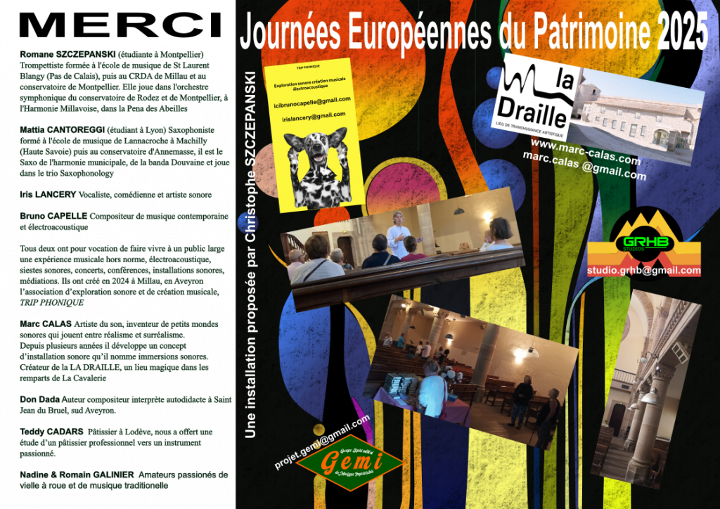 Cette année, à l’occasion des Journées Européennes du Patrimoine, nous avons proposé une visite sonore du temple. Cette installation a réuni plusieurs artistes locaux, invités à participer au projet en composant une minute de musique dans leur propre style.